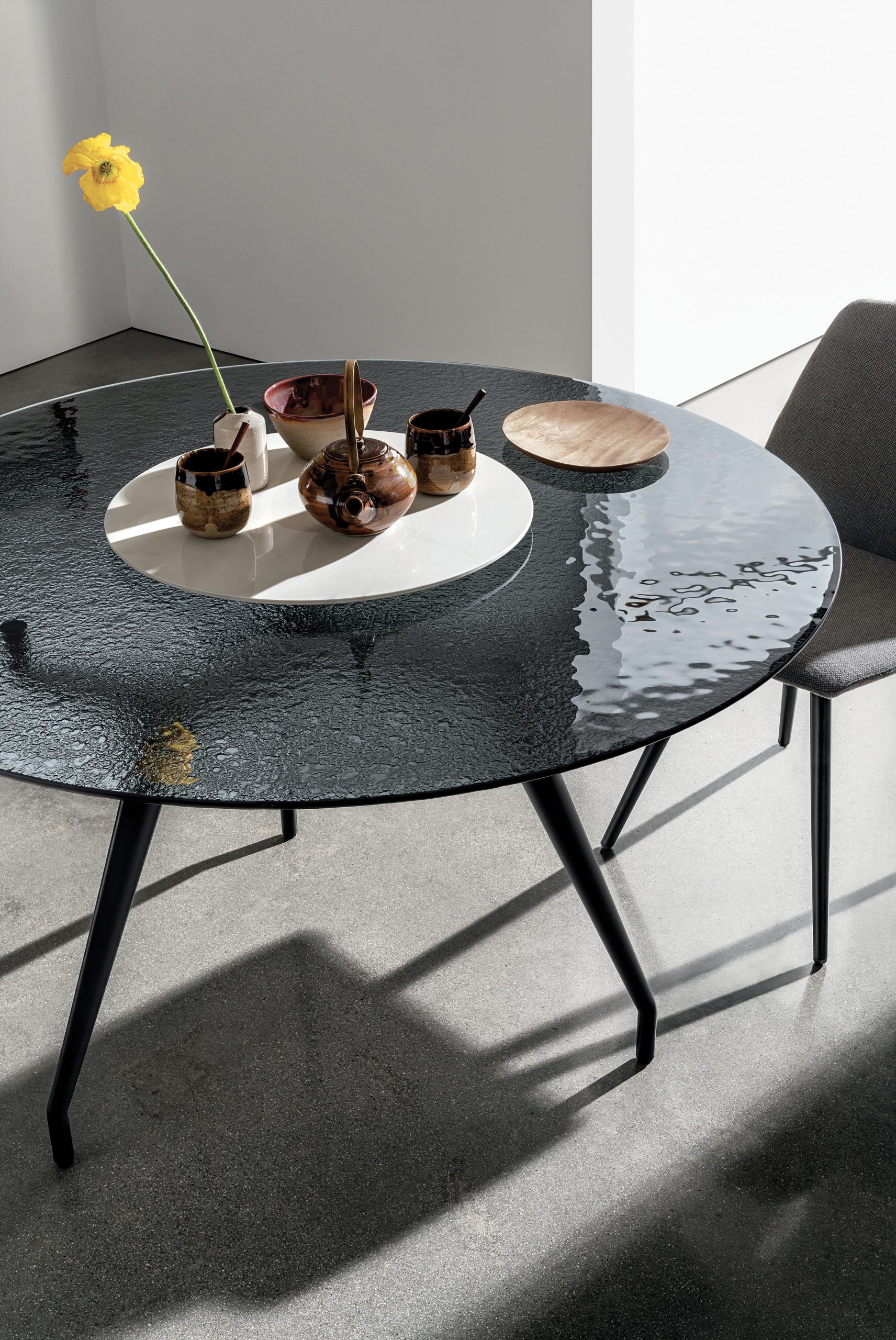Keraaminen ruokapöytä on erinomainen valinta aktiiviseen käyttöön, sillä se kestää lämpöä ja kulutusta. Lasinen versio taas korostaa pöydän keveyttä ja jalustan veistoksellisuutta.