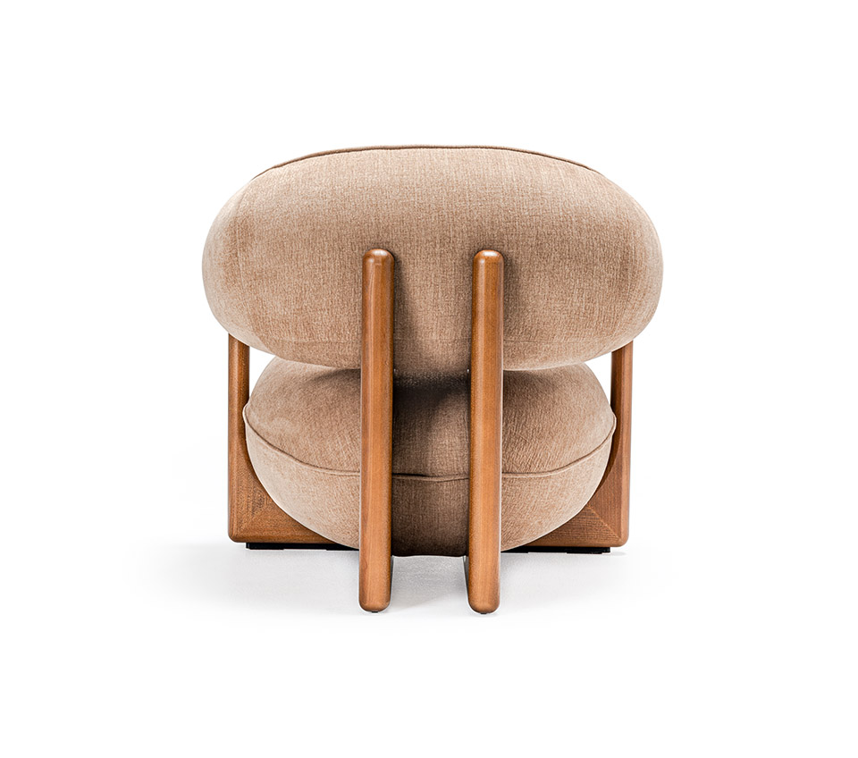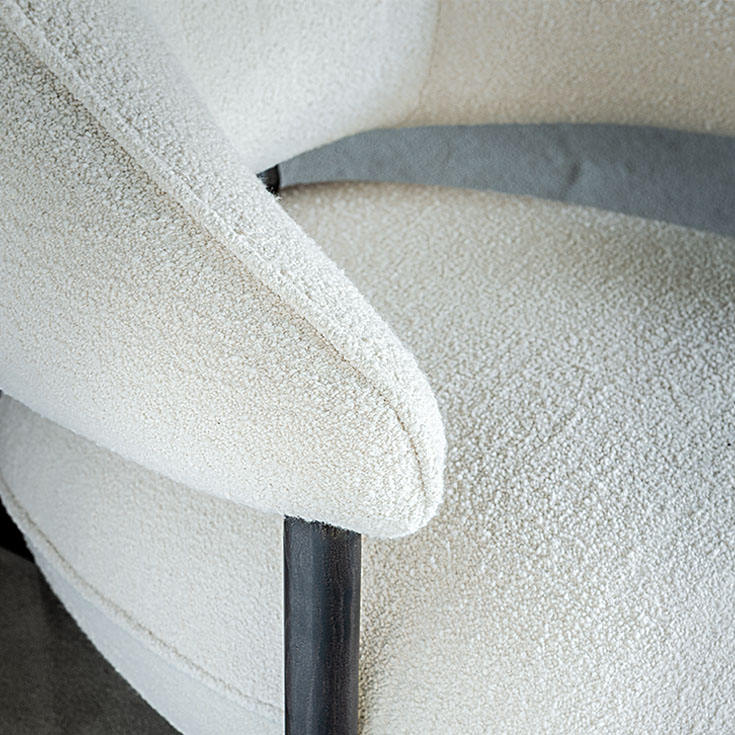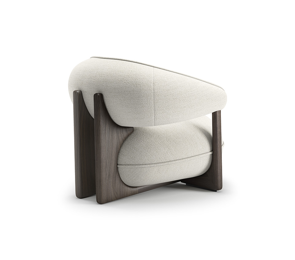 Runko massiivipuuta joko pähkinänsävyistä saarnipuuta tai poltettu tammi. Verhoilu saatavissa useissa erilaisissa materiaaleissa. Istuinosa on runsas ja pehmustettu laadukkailla materiaaleilla. Selkänoja jatkuu saumattomasti käsinojiksi, luoden kokonaisuuden, joka ympäröi istujan lempeästi. Näkyvät ompeleet korostavat käsityötä ja muotoa.