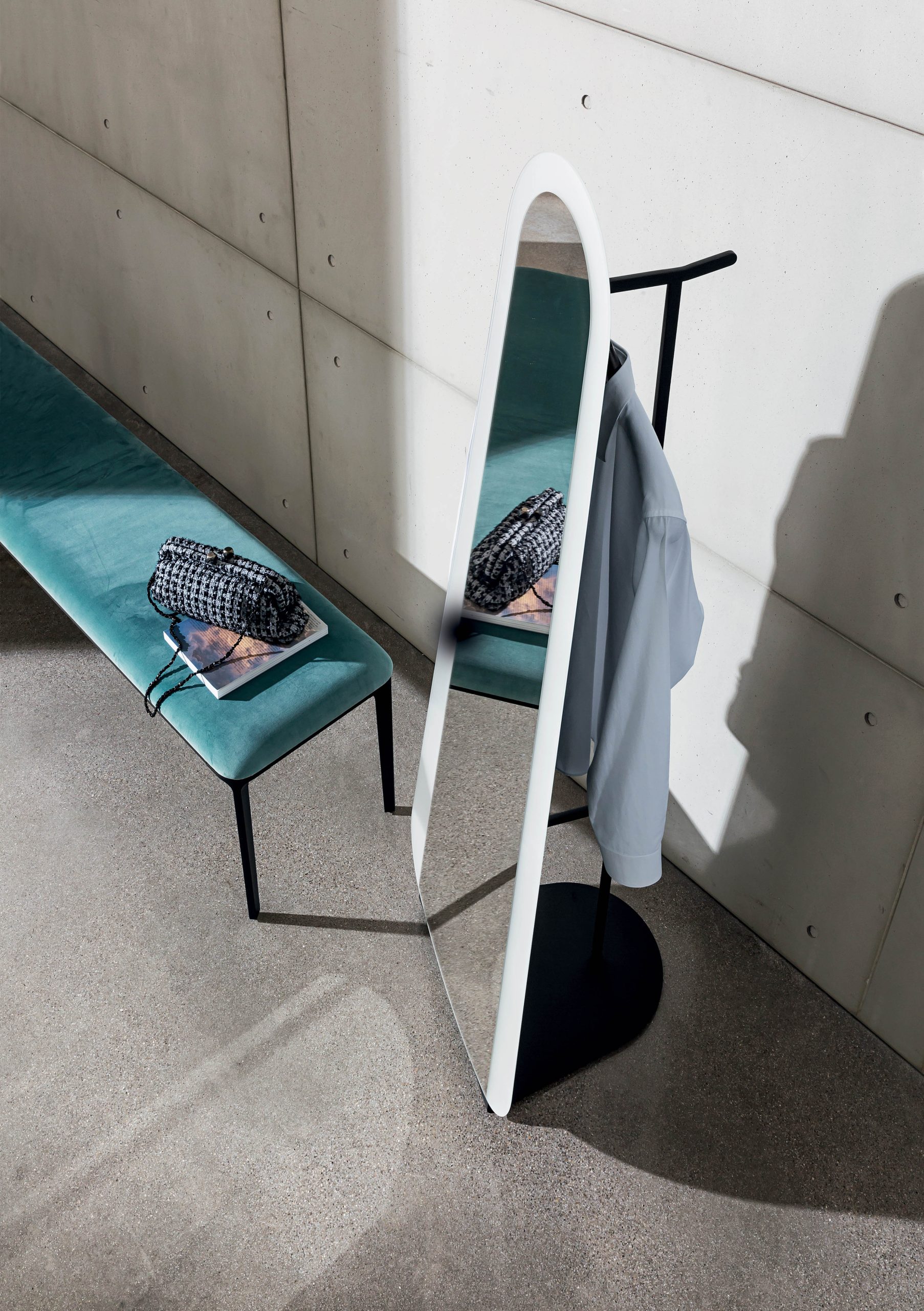 Sovet Italian Clessidra free standing -peili yhdistää heijastavan pinnan ja naulakkotoiminnon, tarjoten sekä käytännöllisyyttä että estetiikkaa.