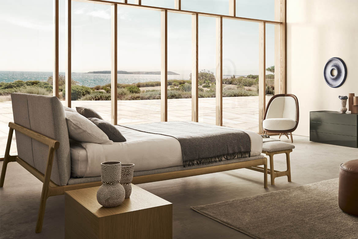 Sänky on valmistettu massiivisesta saarni- tai pähkinäpuusta, jossa on pehmeät, pyöristetyt muodot ja saumattomat liitokset. Pääty ja runko on verhoiltu kankaalla, ja sängyssä on kaarevista pyökkisäleistä koostuva rakenne.