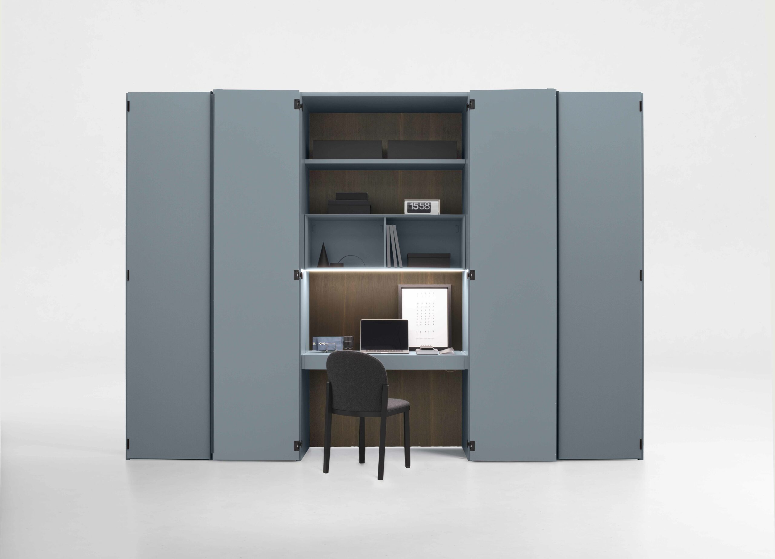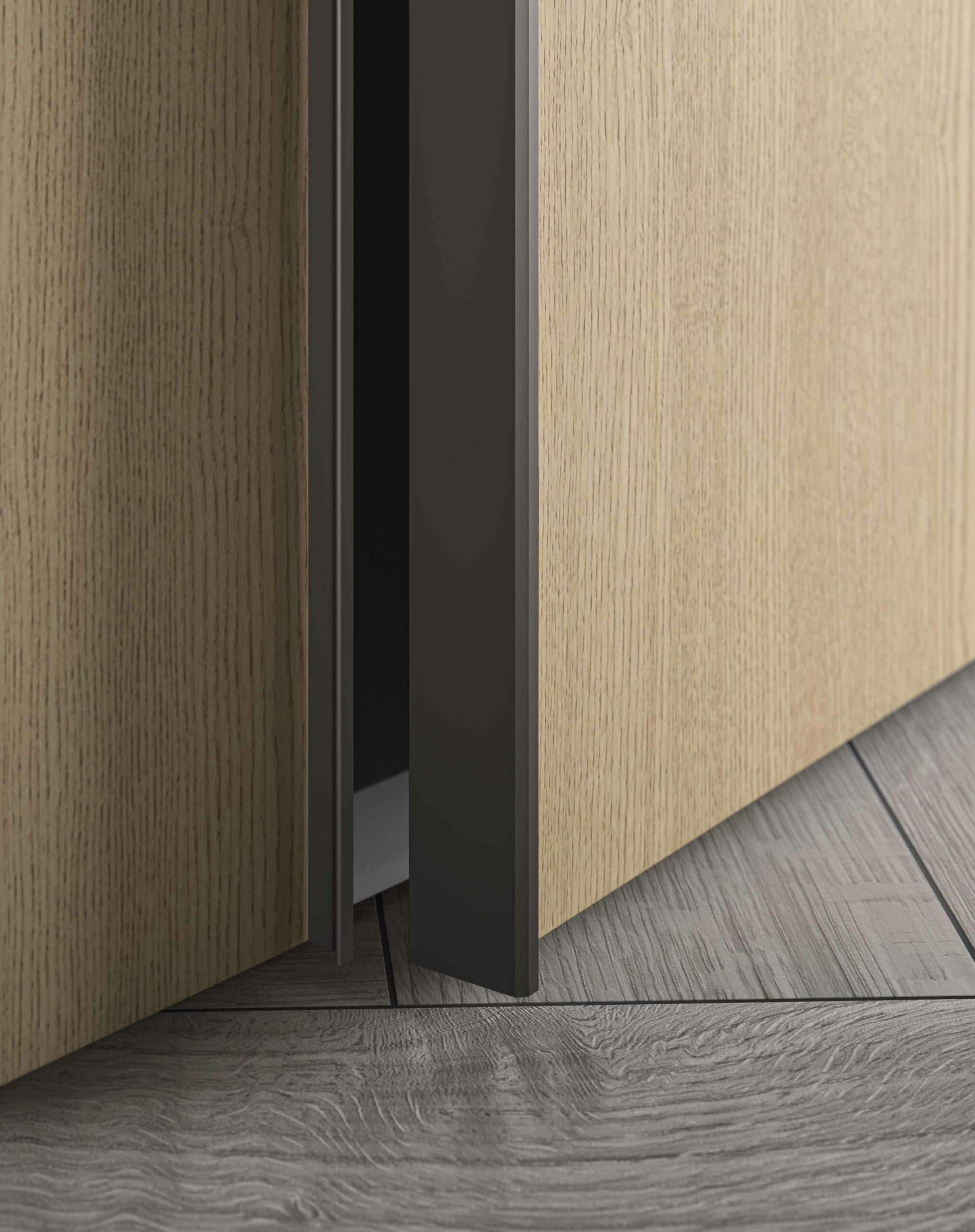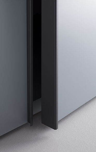 Kun kaappi varustetaan 180 astetta avautuvilla Cardine -saranaovilla, ovet avautuvat kokonaan sivuille eivätkä häiritse työskentelyä. Käytön jälkeen työpiste jää elegantisti piiloon – tila säilyy rauhallisena ja harmonisena.