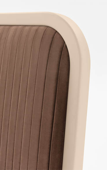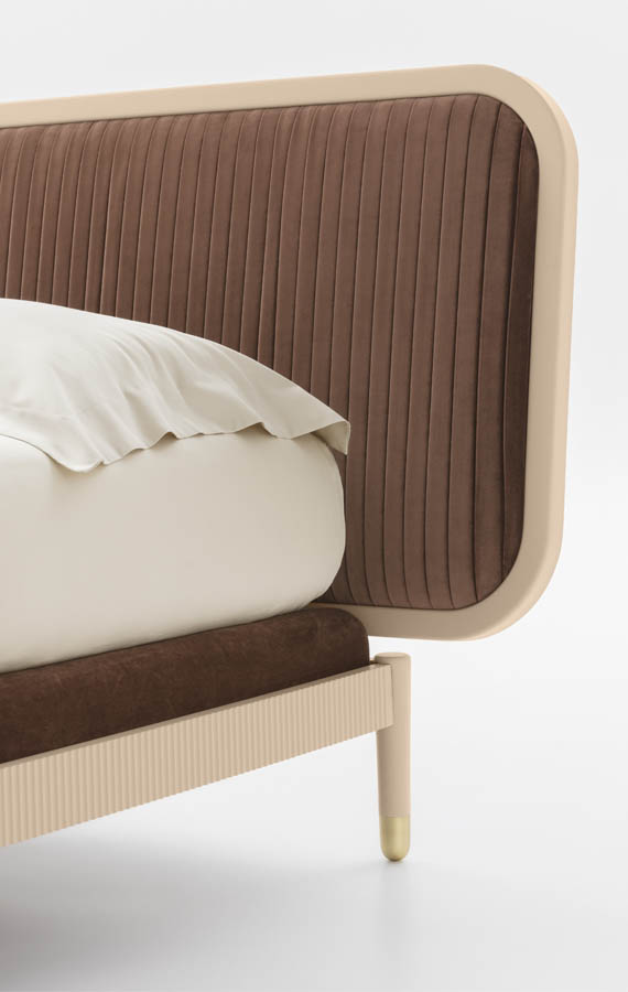 Pääty on saatavilla sileänä tai käsin laskostettuna. Runko uurrettua, maalattua puuta, pehmustettu kehys. Jalat ja päädyn reunat samassa viimeistelyssä; metallireuna aina huurrettua messinkiä.