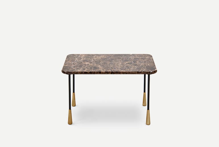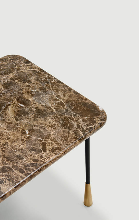 Ohut kapeneva metallijalka tuo pöytään keveyttä ja veistoksellisuutta. Pöytä on saatavilla pyöreänä, neliönä tai suorakulmaisena, mikä mahdollistaa pöydän sovittamisen erilaisiin tiloihin ja käyttötarkoituksiin.
