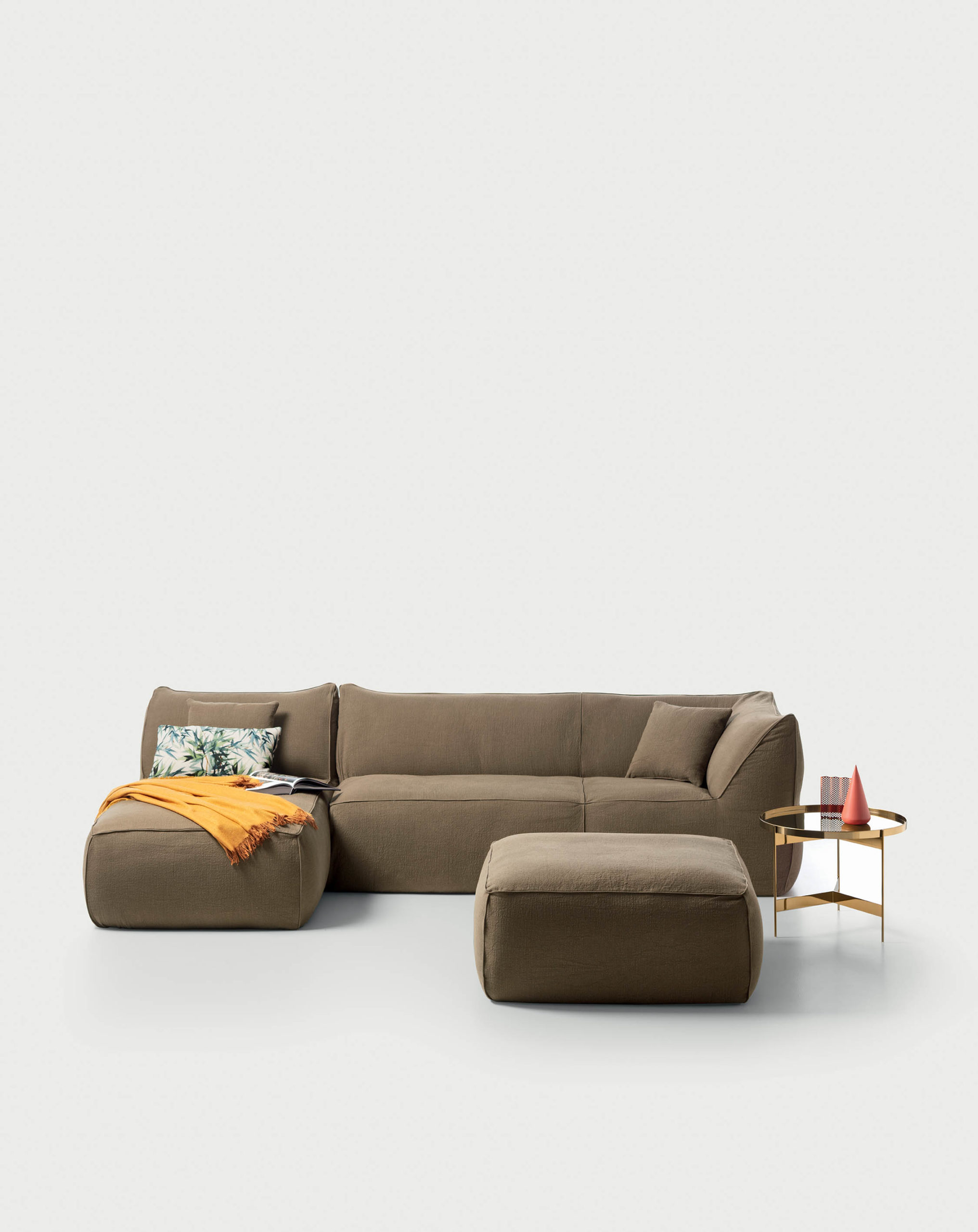 Sohva koostuu eri moduuleista, kuten suorista ja sivumoduuleista, nojatuoleista, lepotuoleista ja rahista, jotka yhdistyvät vetoketjuilla ja hihnoilla. Paksut saumat korostavat sohvan pehmeitä muotoja ja antavat sille modernin ilmeen.