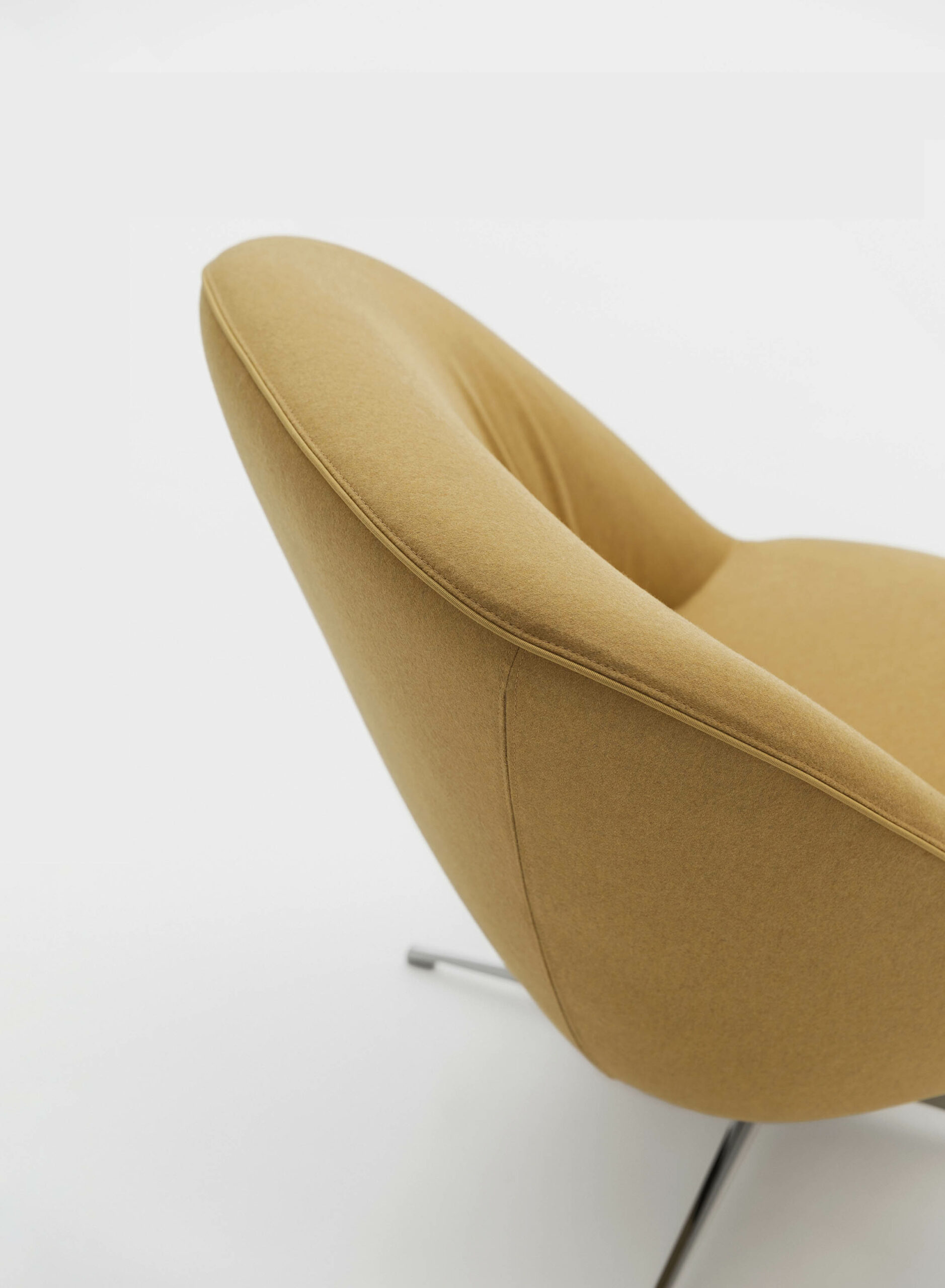 Ella-nojatuolissa on pehmeästi kaartuva runko, joka tarjoaa kutsuvan ja ergonomisen istumakokemuksen. Sen muotoilu muistuttaa lempeää syliä, mikä lisää sen mukavuutta ja estetiikkaa