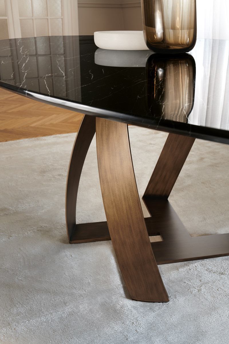 Metallinen jalusta saatavilla useissa viimeistelyissä, kuten antrasiitti, aval, gold, bronzed brass ja corten. Pöytäkansi pähkinäpuuta, pronssilasia tai marmoria.