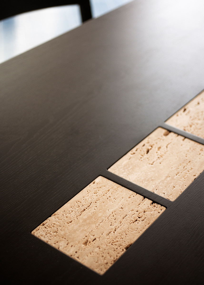 Syn -pöydän jalusta on valmistettu yhdistämällä saarnipuuta ja marmoria. Tämä yhdistelmä tuo pöytään sekä lämpöä että ylellisyyttä. Pöydän kansi on saatavilla pyöreänä tai suorakulmaisena, valmistettuna marmorista tai puusta.