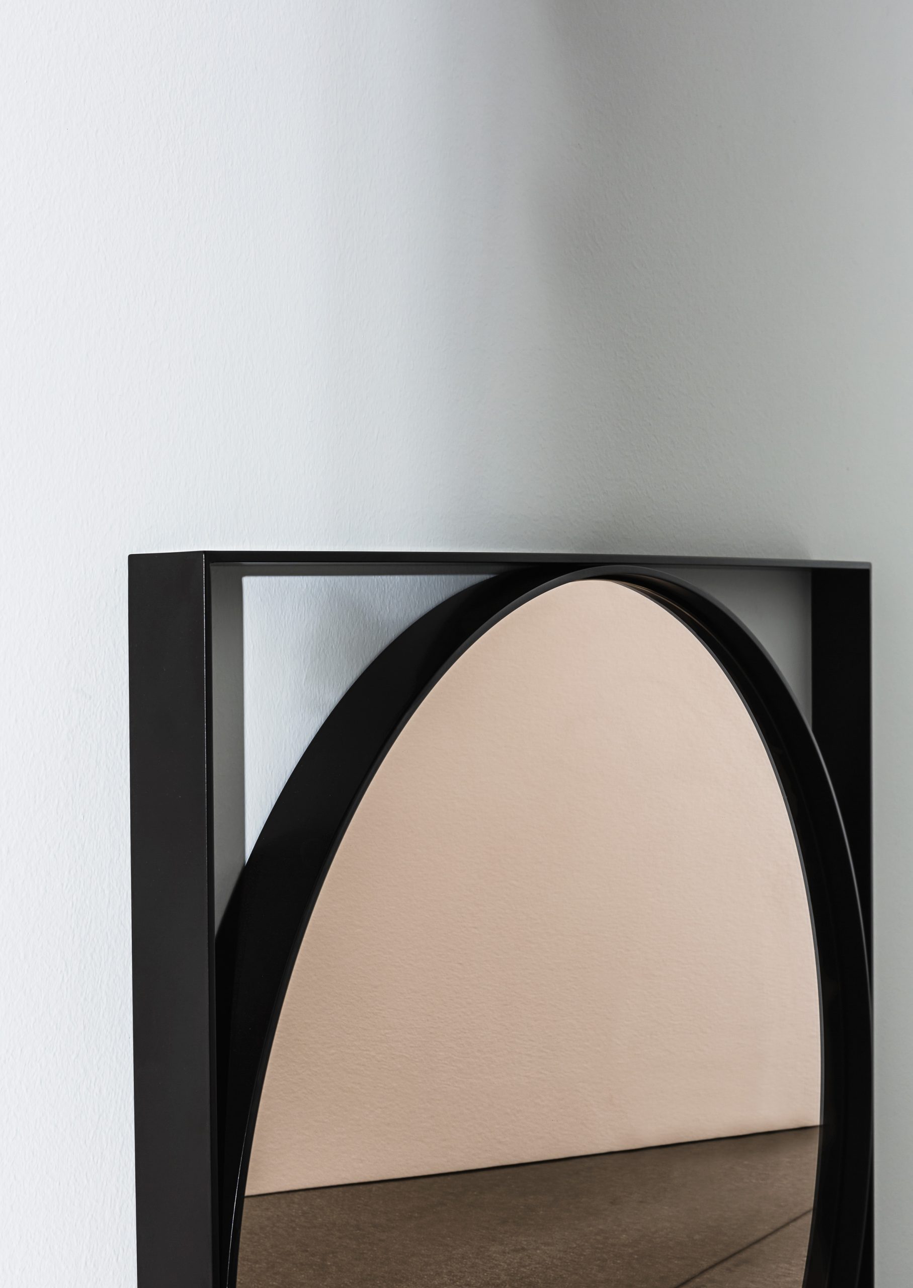 Peili kuuluu Sovetin Visual-mallistoon ja siinä on neliönmuotoinen lakattu metallikehys, joka on saatavilla kolmessa viimeistelyssä: mocha, black, burnished brass.