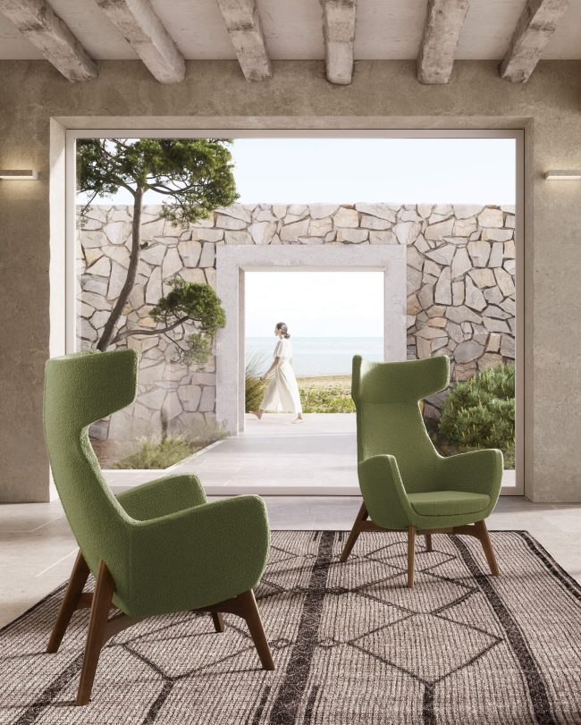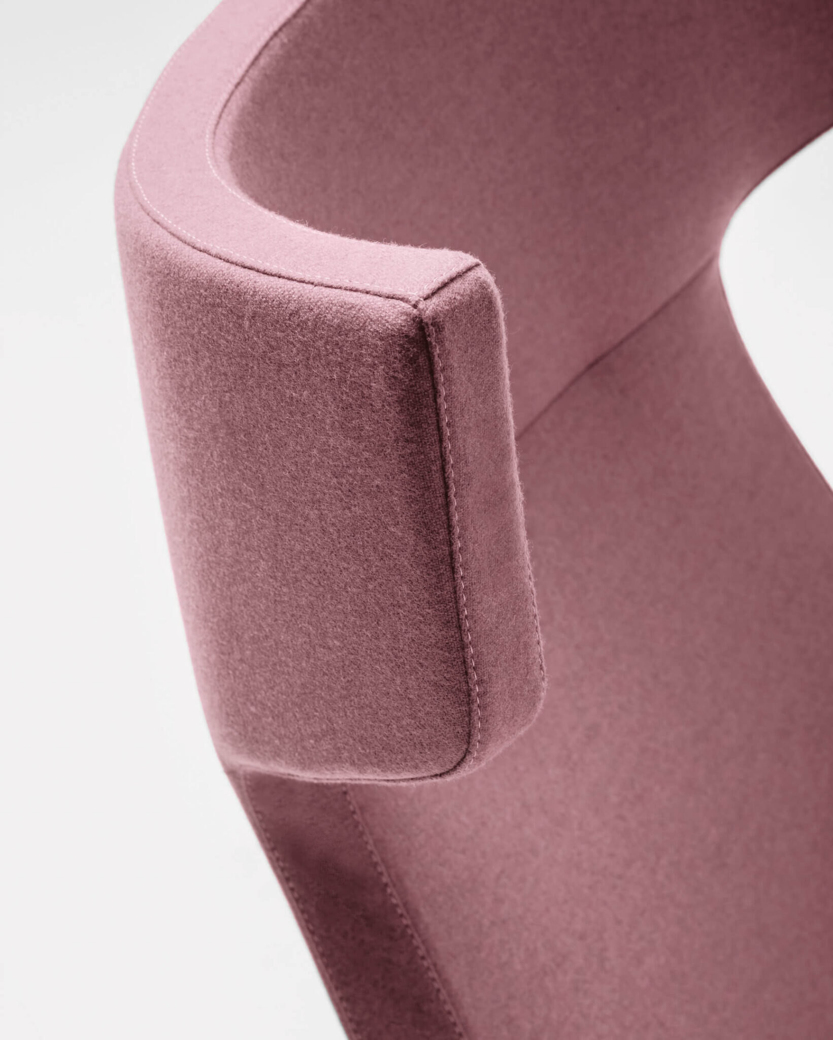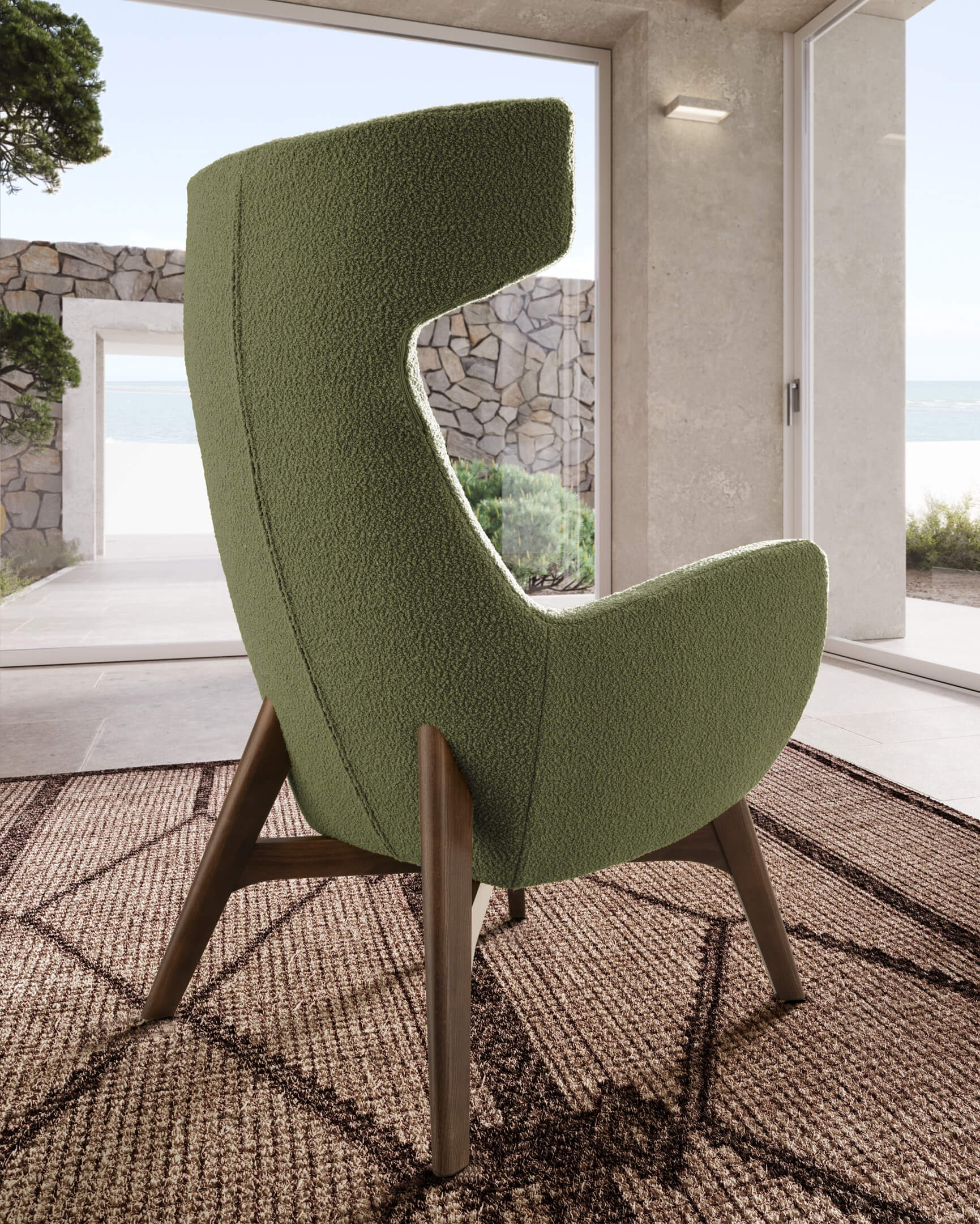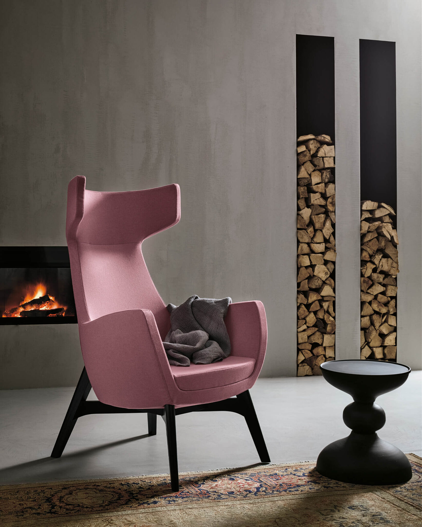 Korkea ja hieman kaareva selkänoja, joka ympäröi istujan, tarjoten yksityisyyttä ja mukavuutta. Verhoilu on saatavilla kankaalla tai nahalla useissa väri- ja materiaalivaihtoehdoissa.